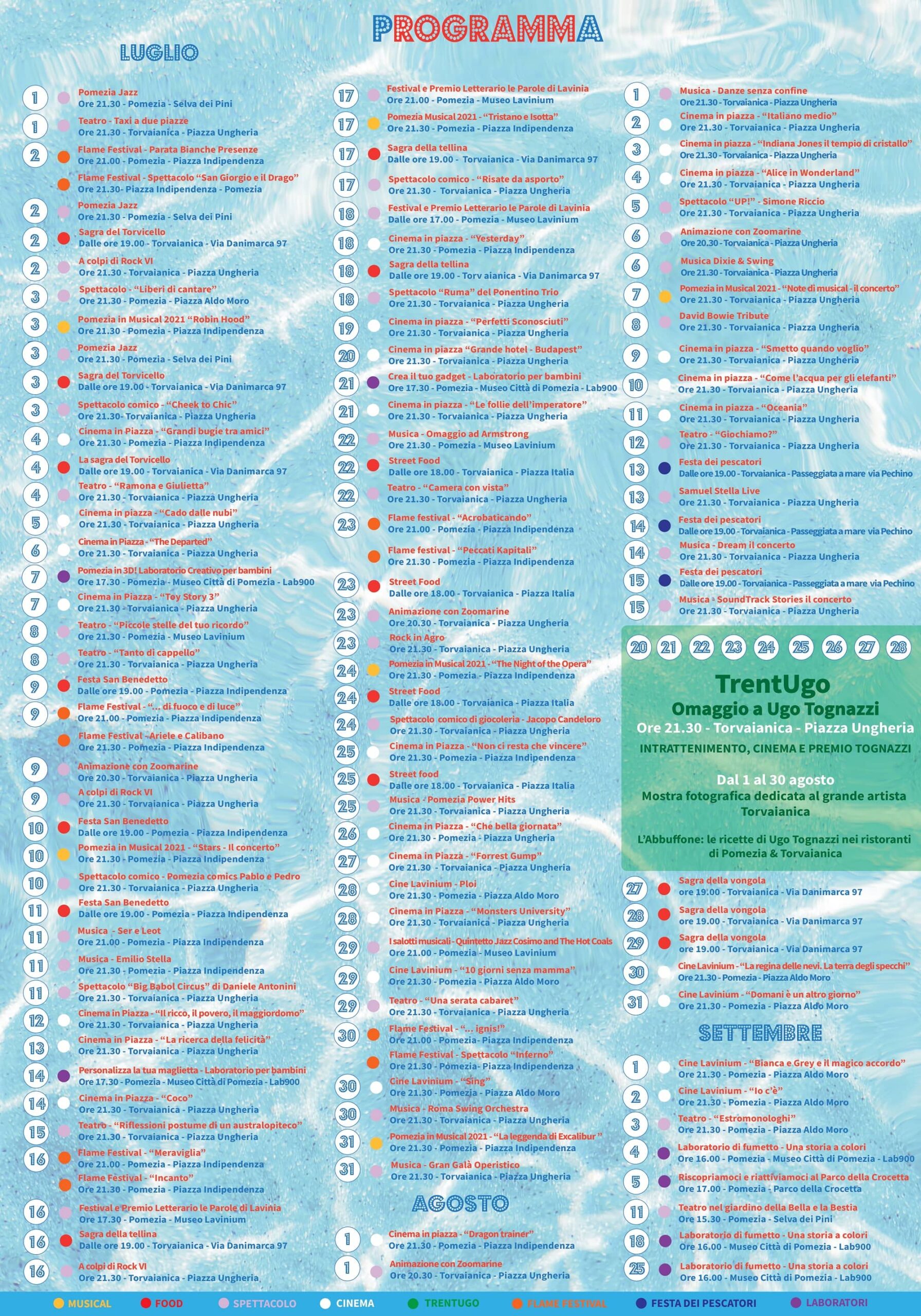 A Pomezia e Torvajanica è in arrivo un bastimento carico di appuntamenti per questa estate 2021. Musica, cultura, spettacoli e tantissimo altro ancora per festeggiare la più bella stagione dell’anno. Il calendario dell’estate a Pomezia e Torvajanica sarà fatto di grandi e piccoli appuntamenti, dalle celebrazioni per Ugo Tognazzi alle tradizionali sagre dell’estate, fino agli appuntamenti più innovativi e originali.