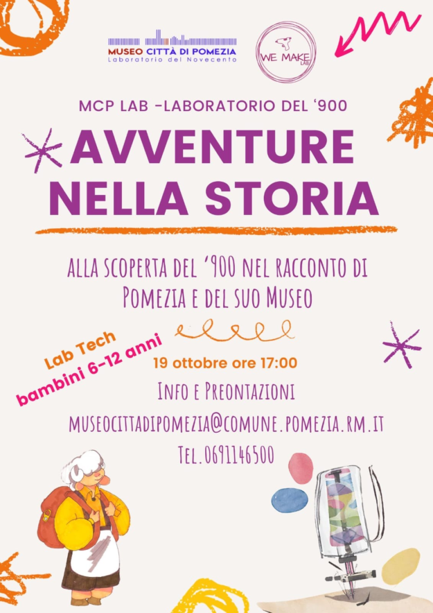 Nell’ambito degli eventi previsti per POMEZIA 84, vi ricordiamo l’appuntamento di: Giovedì 19 ottobre ore 17,00 Laboratorio a cura di We Make Lab Aps, al termine del quale verrà consegnata a ciscun partecipante una copia della nostra miniguida interattiva al Museo e alla Città, “MCPLab900 Avventure nella Storia“, realizzata con il contributo della Regione Lazio, ricca di…