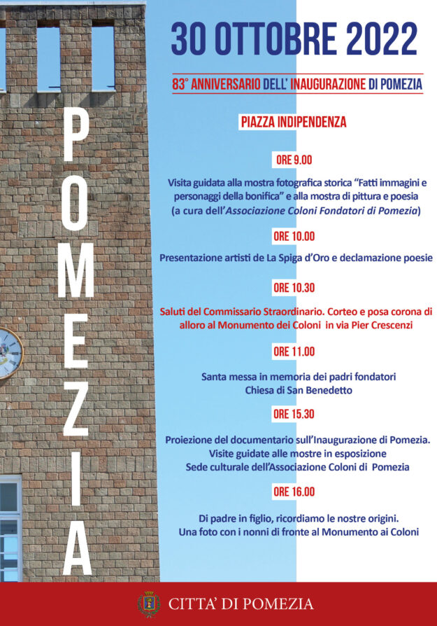 Celebrazioni per l’83° anniversario dell’Inaugurazione della Città (29 ottobre 1939), giornata commemorativa organizzata con il contributo dell’Associazione Coloni Fondatori di Pomezia.