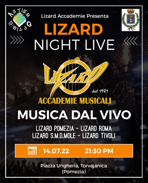 Giovedì 14 Luglio alle ore 21.30 in Piazza Ungheria (Torvajanica) “LIZARD NIGHT LIVE”, una serata di musica dal vivo organizzata e condotta da Lizard Accademie Musicali.