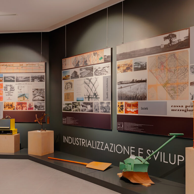 Industrializzazione e Sviluppo – La quinta ed ultima sezione racconta Pomezia dal dopoguerra agli anni della “Cassa del Mezzogiorno”. Di particolare interesse sono l’esposizione dei primi strumenti industriali di produzione e le immagini della documentazione d’archivio proveniente dall’ufficio tecnico comunale che narra l’evoluzione urbanistico-territoriale, sociale, tecnologica e produttiva di Pomezia nel periodo del “Miracolo Economico Italiano”.
