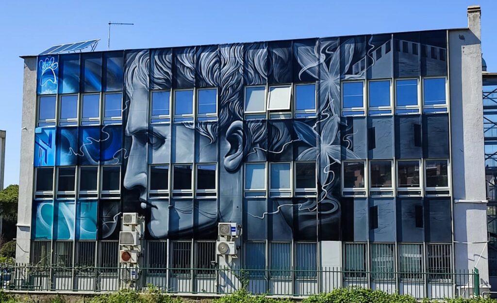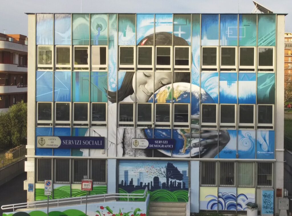 Sulla parete centrale e frontale della palazzina dell’Anagrafe di Pomezia, ha origine il futuro della Città e non solo. Con l’opera “Amore per la nostra terra”, Steven ha realizzato un realistico di grandi dimensioni che raffigura una bambina, simbolo delle nuove generazioni, che cresce con la consapevolezza di dover rispettare, coccolare e amare la #Terra e l’ambiente che ci circonda. Sullo sfondo un astratto che richiama invece attraverso geometrie e linee un futuro tecnologico.