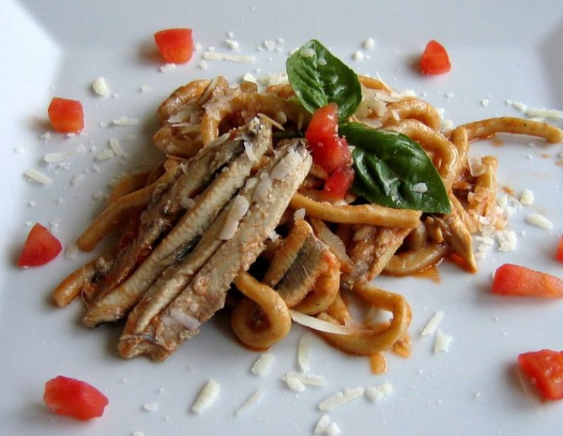 La ricetta tipica vuole il Torvicello cotto in abbondante acqua salata, poi mantecato in una padella piuttosto ampia nella quale si fanno sciogliere leggermente delle alici fresche insieme al pomodoro San Marzano, a un trito di aglio e cipollotto, il tutto condito con peperoncino, basilico e finocchio selvatico. Una volta pronto, si condisce il tutto con una spolverata di pecorino romano DOP.
